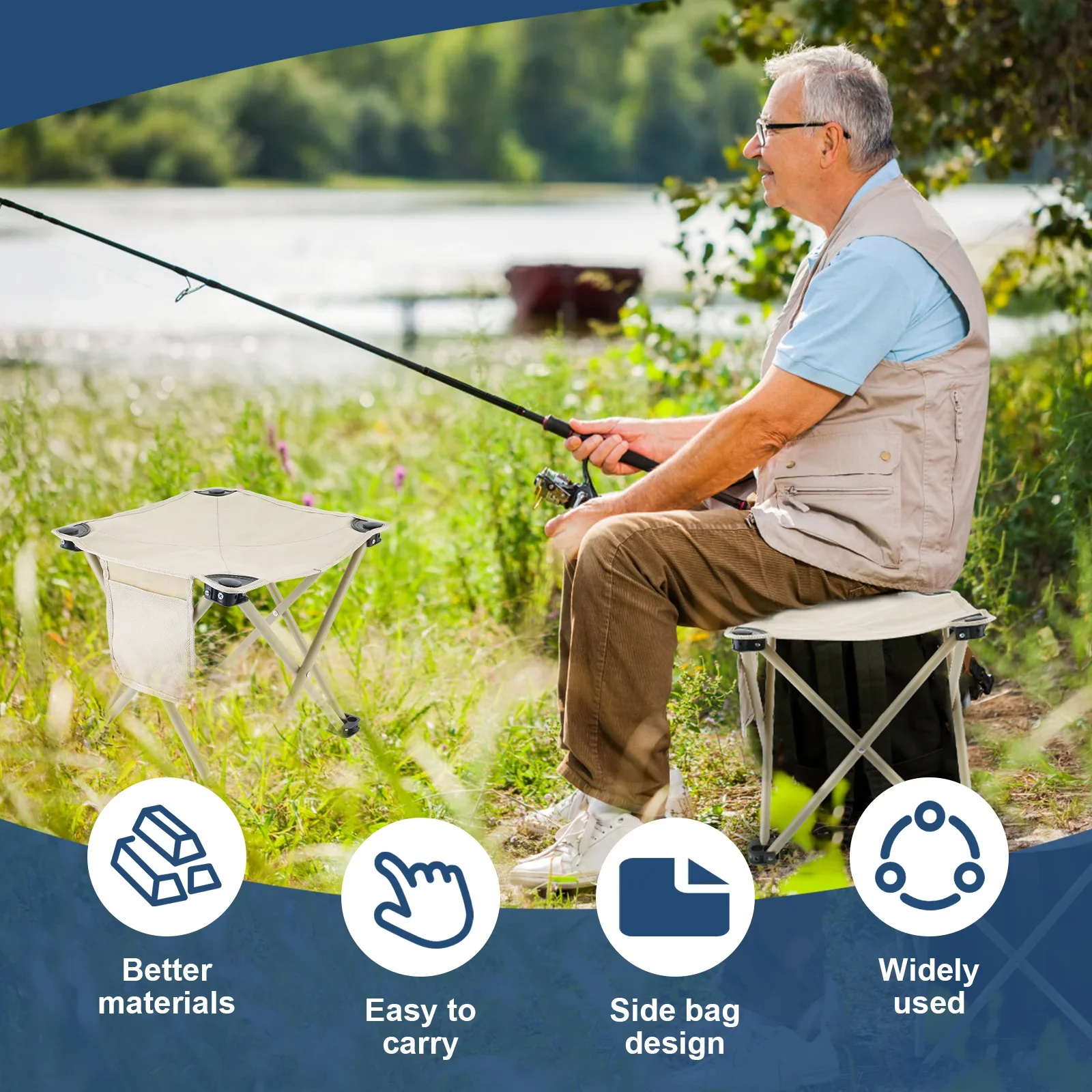 With Side Pocket: This portable folding stool is designed with a side pocket where you can put your phone, drinks, snacks, water bottles while fishing, camping, or other outdoor activities. Keep items neat and quick to access